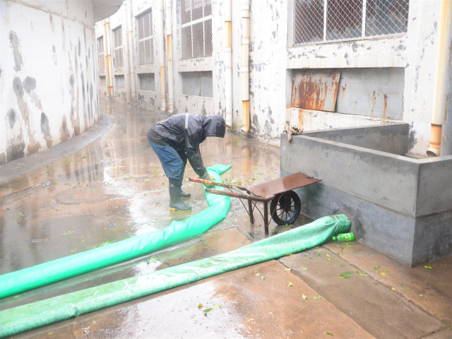 8月10日,臺風(fēng)帶來的強(qiáng)降水洶洶而至。公司黨委書記、董事長王力民到公司各處巡查督導(dǎo),防汛應(yīng)急小組成員各就各位,各部門按職能分工,全力以赴投入到鏖戰(zhàn)“利奇馬”這場硬仗當(dāng)中。為了防止雨水進(jìn)入生產(chǎn)車間,各車間在提前安裝好防水擋板、壘砌防汛沙袋基礎(chǔ)上,每個(gè)出入口都安排專人看護(hù),對出現(xiàn)漏水、漏電等情況及時(shí)采取措施。在生產(chǎn)現(xiàn)場,相關(guān)設(shè)備人員及時(shí)檢查電源柜、防汛泵等設(shè)備,保障正常運(yùn)行;提前增加的安全照明裝置,有效增強(qiáng)了臺風(fēng)期間的現(xiàn)場亮度。針對室外積水積水較深這一情況,開啟防汛泵,將積水排入雨水管道,對積水超過100㎜后安插警示標(biāo)識,并且擺放防汛凳,保障員工安全出入;對外圍排水口及下水管道及時(shí)沖洗、清理,以避免廠區(qū)積水影響到生產(chǎn)運(yùn)行。