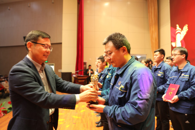 1月4日,公司在持續深化精益生產年度總結動員大會上,公司對獲得2019年度(第三屆)“華紡工匠”的5位員工進行了表彰,副總經理盛守祥為他們頒發獎杯。
