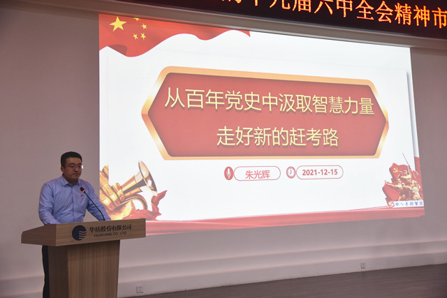 12月18日,市委宣講團成員、市政協臺港澳僑和外事委員會副主任朱光輝來到公司,對黨的十九屆六中全會精神進行專題宣講。宣講會由公司團委書記陳冰主持,公司黨委成員、行政班子成員、黨支部書記、黨員代表、預備黨員以及來自公司各個序列的中高層管理者,共120余人在聆聽了當天的宣講。