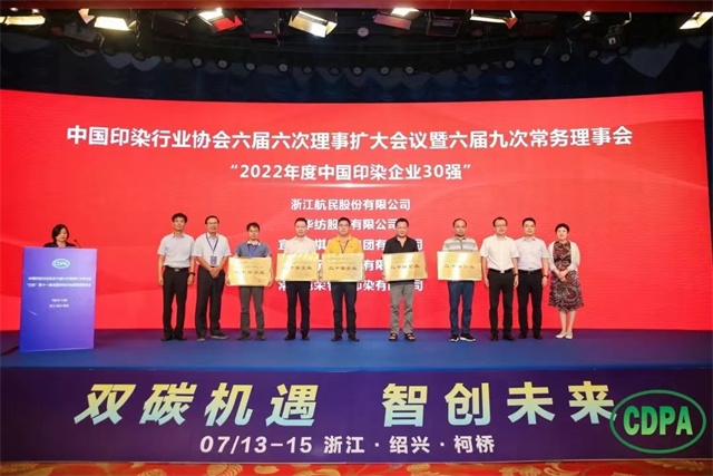 7月14日,中國印染行業協會六屆六次理事擴大會議暨六屆九次常務理事會在浙江紹興召開。會上,中國印染協會發布了“2022年度中國印染企業30強”名單,公司以在多方面的綜合成效躋身這一行列。