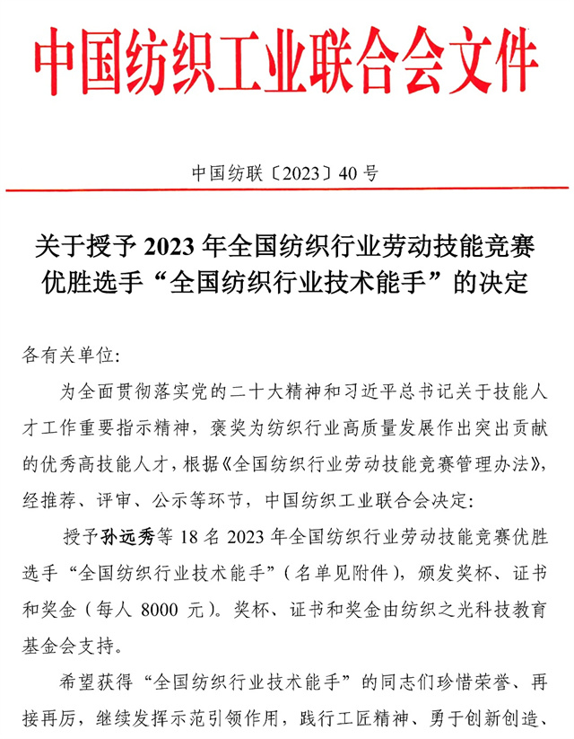 導讀:近日,中國紡織工業(yè)聯(lián)合會發(fā)布了授予在2023年全國紡織行業(yè)勞動技能競賽中取得前18名的紡織企業(yè)員工為“全國紡織行業(yè)技術能手”榮譽稱號的決定,