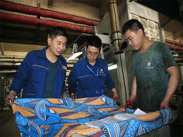 3月17日,花一車間南印制甲班班長吳樂、印花機機長李彬彬和副機長牟石磊,圍繞當班印制產品的質量展開改進分析,力求使本班產品印制提升到一個更好的水平?;ㄒ卉囬g、花二車間所生產的產品,絕大比重為出口國外市場,在非洲等傳統市場占有重要的市場份額和良好的市場信譽,靠的即是穩定而過硬的產品質量。花一車間、花二車間堅持“產品為王、質量制勝”的思想,使員工的質量意識得到持續增強。他們普遍認識到,質量是一個旅程,永遠沒有終點。