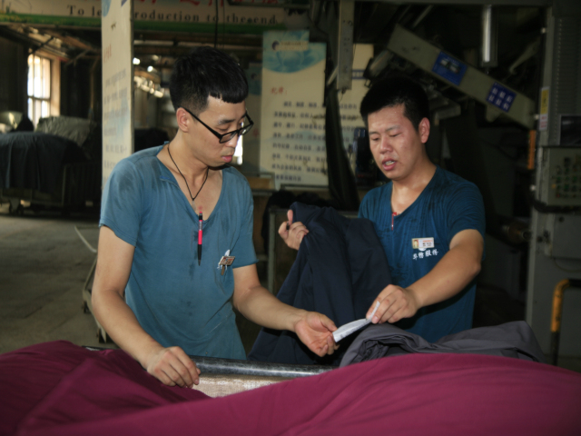 面三車間陳萬龍(圖右)在與本車間后處理預縮機機長王巖軍核對完試驗布數(shù)據(jù)后,說:“氣溫高,我們的勞動熱情更高!”