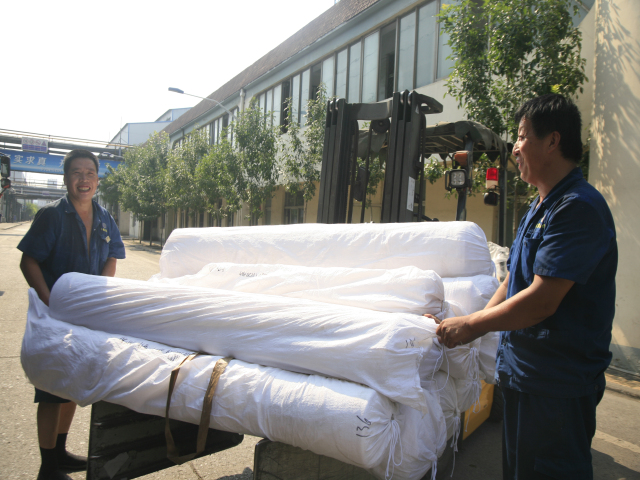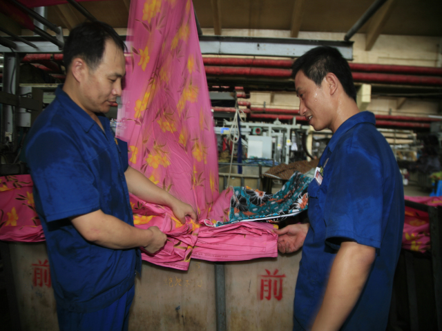 家紡車間前處理340絲光機出檢工李娟(圖左)與前來推布的360拉幅機進檢工朱濤交接產(chǎn)品。李娟說:“天氣越熱,我們越要互相提示,注重細節(jié),保證安全,保證品質(zhì)。”