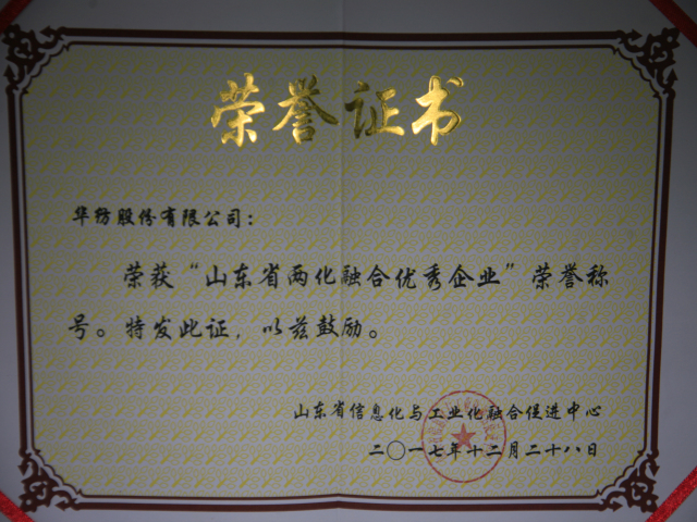 2017年12月28日,山東省信息化與工業化融合促進中心公開表彰了“山東省兩化融合優秀企業”,公司以近年來在兩化融合方面的卓越表現,榮登這一榜單。